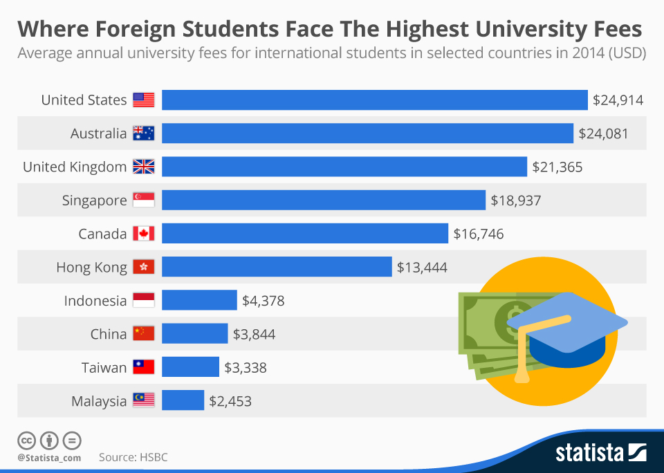 In den USA, Australien und England zahlen ausländische Studierende die höchsten Studiengebühren. Quelle: Statista