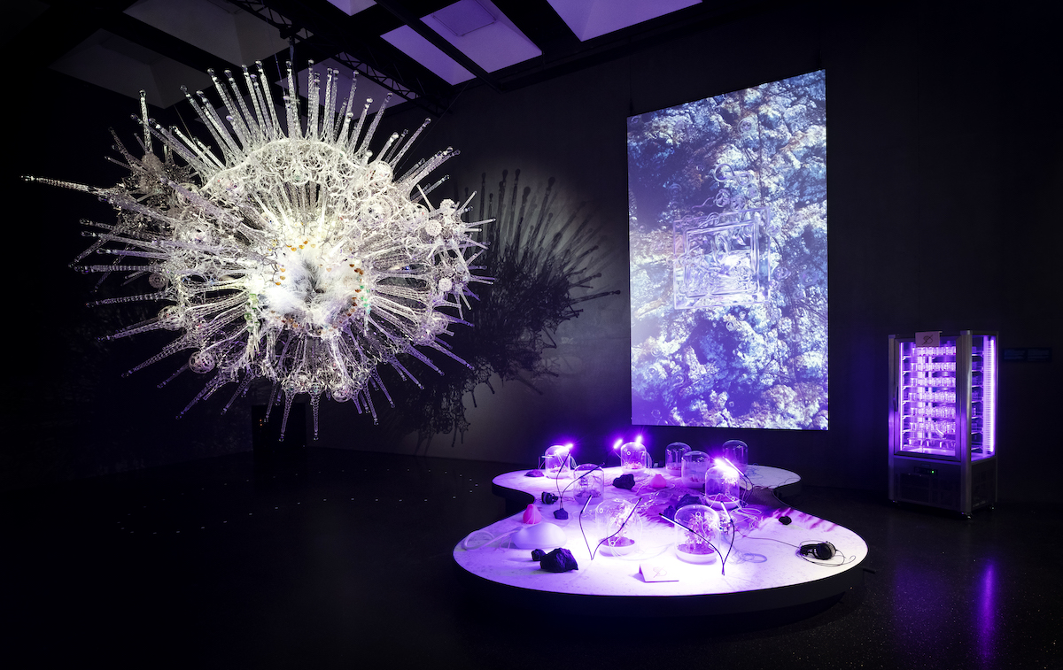 In der Installation „The Outside Inside“ von Designerin Johanna Schmeer zeigt sie in einem Live-Experiment, wie eine Pflanzenwelt nach dem Klimawandel in einer überhitzten und weitgehend trockenen Welt aussehen könnte. Auch die riesige Design-Fiction-Skulptur von Philippe Bies „Noosphere“ ist eine konkret gewordene Künstliche Intelligenz. Es ist der Versuch, eine KI zu verdinglichen – gebaut weitgehend mit handelsüblichen Materialien! Ihre rätselhafte Aura ist zugleich eine wunderbare Metapher für die Zukunft.