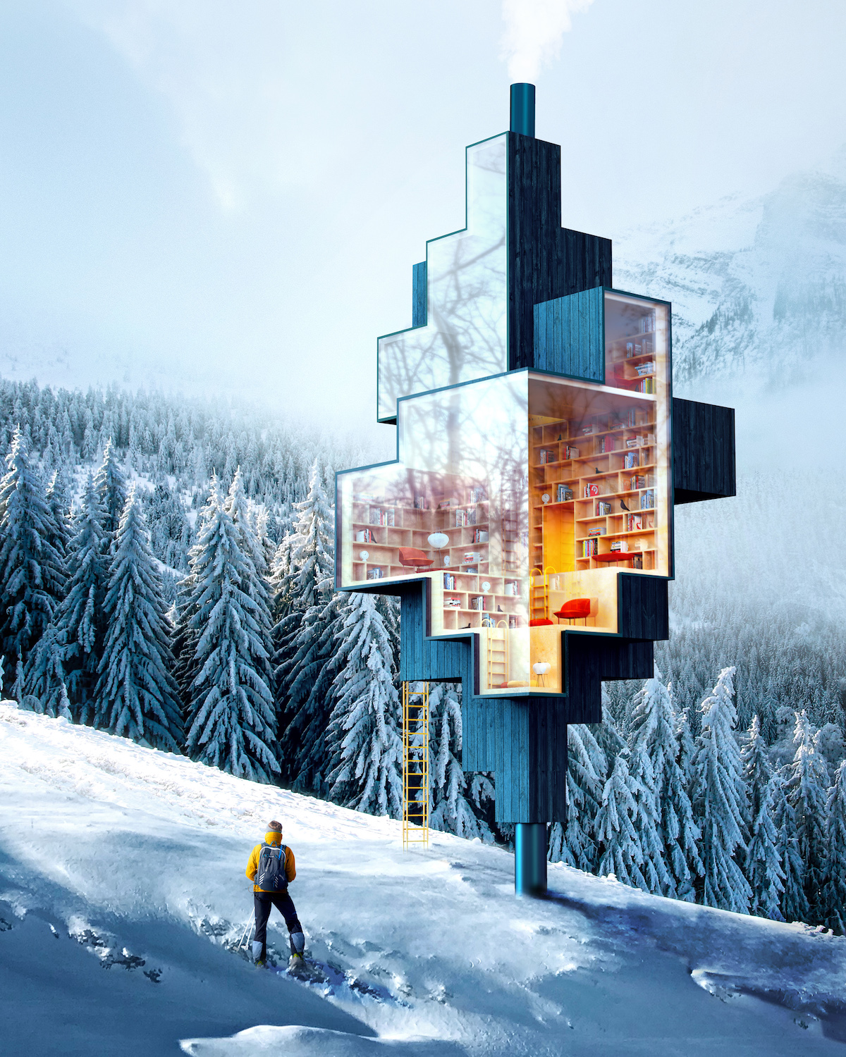 Der Entwurf einer einladenden, kleinen Bibliothek mitten in einem winterlichen Wald. Foto: Monika Woźniak.