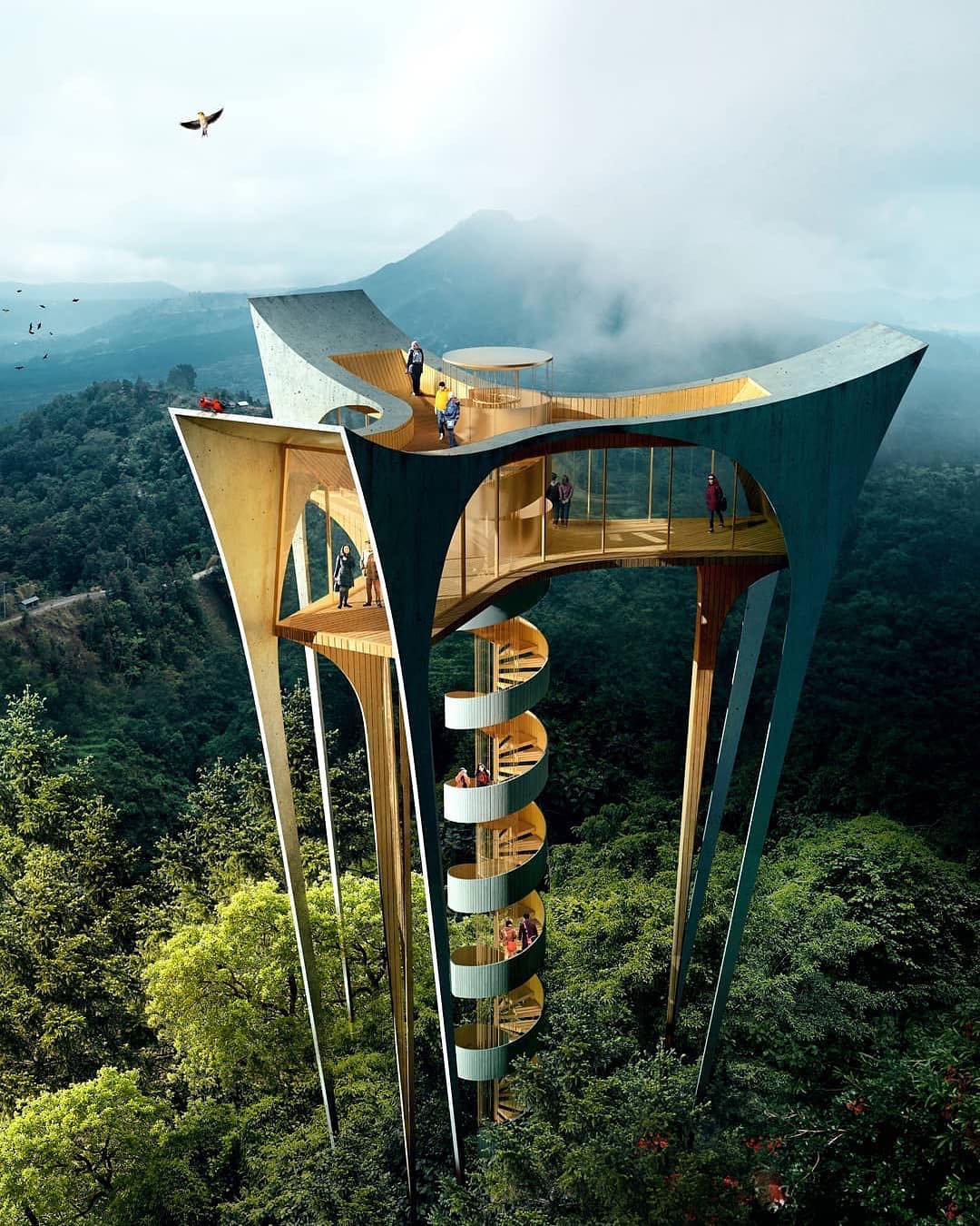 Die Orte, die ich erschaffe, sollen für den Betrachter eine Verbindung zur Natur herstellen. Ein Ort, an dem die Grenzen zwischen Architektur und Natur zu verschmelzen beginnen und wir als Menschheit harmonisch mit unserer natürlichen Umgebung koexistieren können. Da meine architektonischen Entwürfe über @Antireality normalerweise auf Freizeitaktivitäten ausgerichtet sind, neige ich dazu, mehr über diesen Teil unseres Lebens nachzudenken. Orte an denen Menschen, die sich gerne in der Natur aufhalten, eine Pause machen und einen Kaffee trinken können. Friedlich, ruhig, spielerisch und einladend – sowohl für die Natur, als auch für uns Menschen.