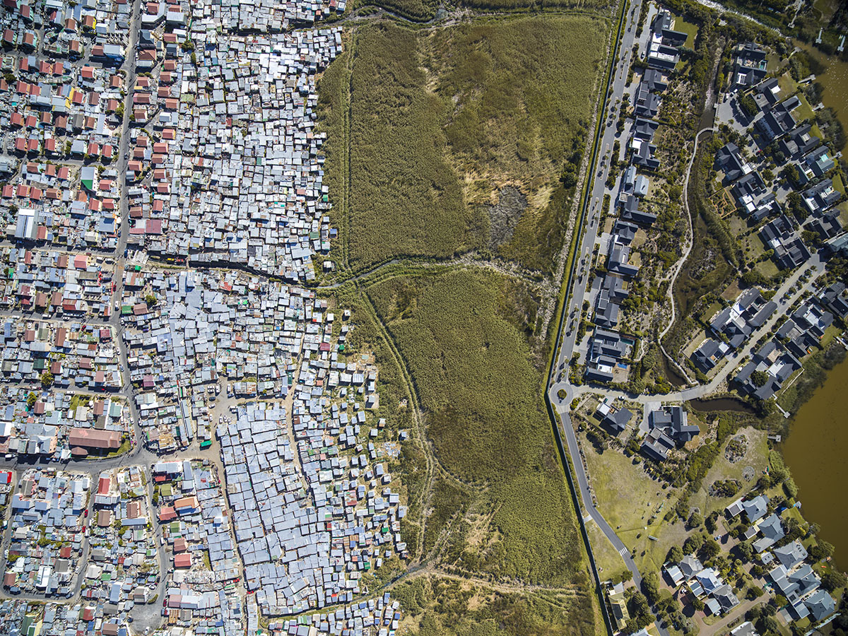 2016 besorgte der Fotograf Johnny Miller sich eine Drone und fotografierte das Township Masiphumelele und die angrenzende, wohlhabende Gemeinde Lake Michelle in Kapstadt. Das Foto ging über Nacht viral. Bild: Johnny Miller