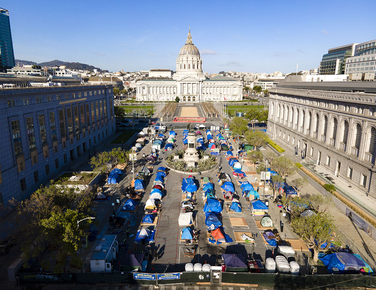 Vor dem Rathaus von San Fransico tummeln sich Zelte von Obdachlosen. Die Coronapandemie und die steigenden Immobilienpreise in einer der wohlhabendsten Städte der Vereinigten Staaten haben dafür gesorgt, dass viele sich die Mieten nicht mehr leisten können. Bild: Johnny Miller