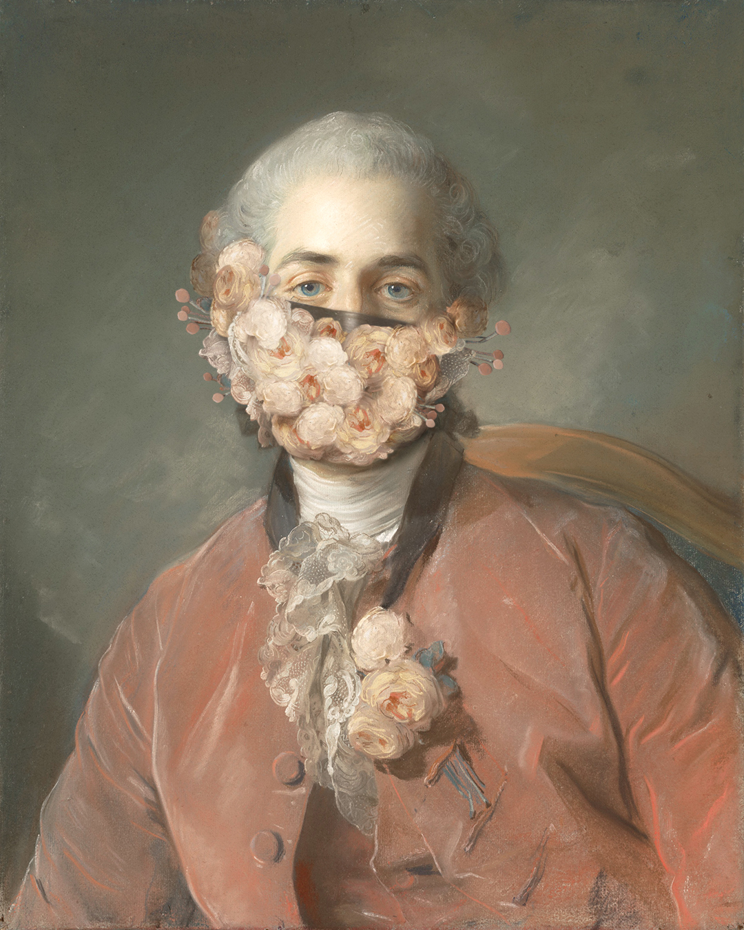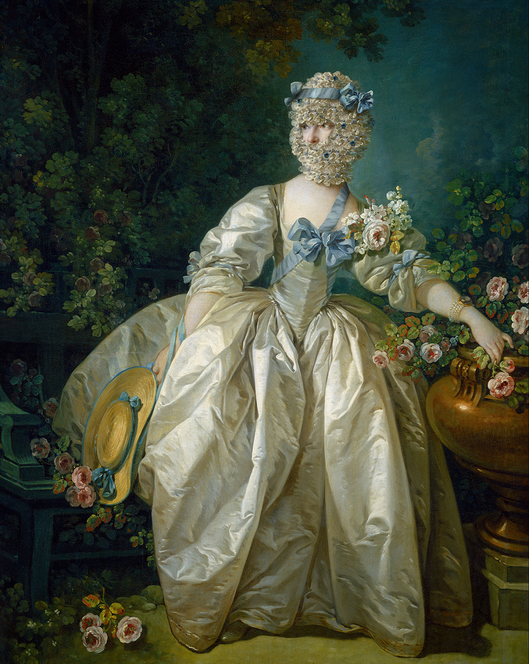Absolut, da stecken viele zeitkritische Aspekte drin. Ich finde, dass das freie Künstlertum heutzutage wieder bedroht ist. Indem ich aufzeige, was Künstler im Auftrag malen mussten, weise ich darauf hin, dass wir uns dort langsam wieder hinbewegen. Ich beziehe auch andere aktuelle Diskurse, wie z.B. die Genderdiskussion mit ein. Wenn man Gemälde nimmt, in denen Frauen eigentlich nur als Dekoration gezeigt werden, kann man nicht von Gleichberechtigung sprechen. Ich spitze das dann auch noch zu, um darauf explizit hinzuweisen. Oder auch Mode als Fetisch. Was Frauen in vielen Zeiten an Einschnürungen und Körperumformungen ertragen mussten, um einem gewissen Schönheitsideal zu entsprechen, war eigentlich reiner Fetisch. Das Interessante dabei ist, dass es noch nicht einmal abwegig aussieht, wenn ich einer Dame auf einem Barockportrait eine Fetischmaske aufsetze. Aber um noch einmal auf die Zeitkritik zurückzukommen: Nur eine kleine herausgehobene Schicht konnte sich übrigens solche Portraits leisten. Von der früheren Gesellschaft, vor der Fotografie, sehen wir quasi nur die Elite. Die Gesichter der anderen Menschen sind vergessen.