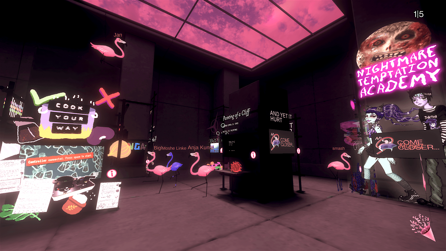 Dass aber ein großes Budget für eine tolle immersive Erfahrung überhaupt nicht notwendig sein muss, zeigte neben dem Club Matryoshka auch das Berliner Indiegame-Festival A_MAZE. Das verlegte Ende Juli seine jährliche Konferenz mit Preisverleihung komplett ins Virtuelle. Dafür wurde ein 3D-Ausstellungsraum von Gamedesigner Moshe Linke zur Multiplayer-Experience umfunktioniert, in dem sich die User*innen als Flamingo-Avatare tummelten. Unter anderem konnten sie darin eine Konfettikanone anwerfen und nebenher auf YouTube den Panels, Talks und der Award Show folgen. Die einzelnen Games waren als Installationen mit Clips und Infos sichtbar und konnten sogar im virtuellen Raum auch gleich gespielt werden.