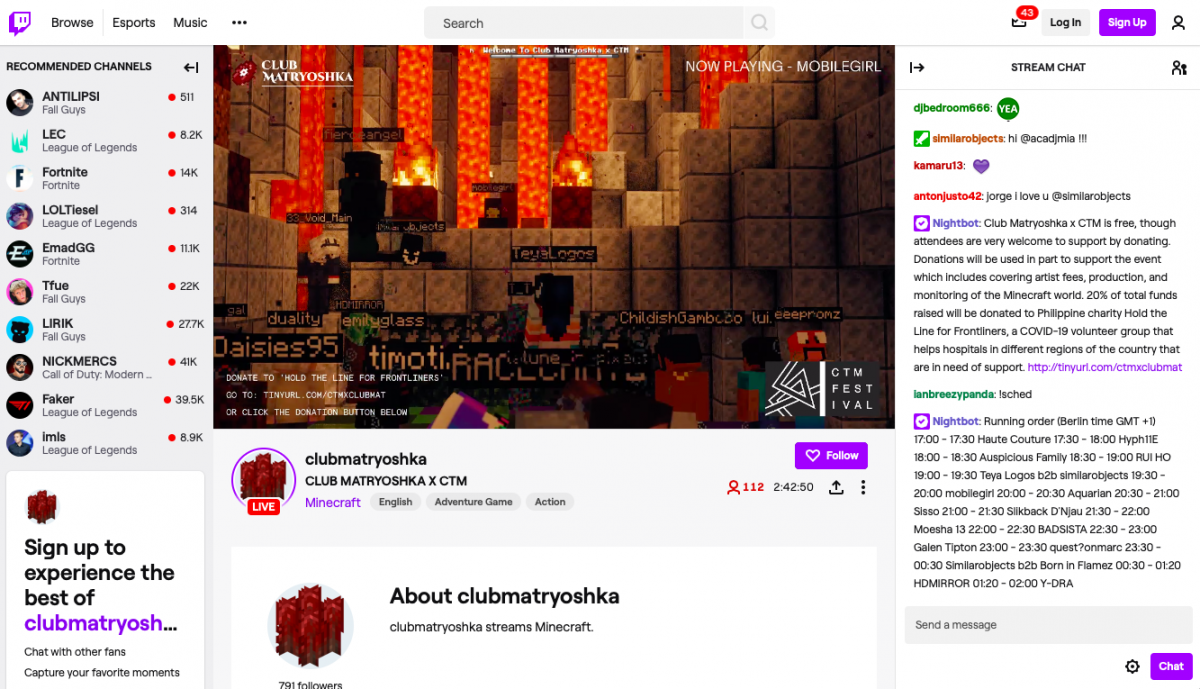 Schließlich nehme ich die Abkürzung zum Dancefloor und wechsel zum Kanal von Club Matryoshka auf der Live-Streaming-Plattform Twitch. Da gibt es die ungehinderte Sicht auf den jeweiligen DJ-Avatar, der eine ziemliche elektronische Bandbreite von Gabber bis Noise abdeckt, und den Dancefloor mit darauf hopsenden Avataren. Zudem gibt es mehr Interaktionsmöglichkeiten, jeder darf in einem Chatfenster kommentieren. Denn das ist das eigentlich andere am virtuellen Club: Die Kommunikation findet auf mehreren Kanälen und Ebenen zeitgleich statt, das Visuelle auf und vor der Bühne ist nur ein Teil der Gesamtinteraktion. Sowohl in Minecraft als auch auf Twitch gibt es ein Chatfenster, ein Großteil geschieht auch noch über die verschiedenen Kanäle auf Discord. Während das Audio der DJ-Sets im Stream abläuft, kann dort jede*r User*in mit den Künstler*innen chatten, sich bedanken oder auch nach den jeweiligen Tracks fragen. Gespendet werden für die Künstler*innen darf natürlich auch – entsprechende Hinweise erscheinen immer wieder in jedem ChatFeed. Im nächsten Kanal können sich die User*innen austauschen, technische Hilfe gibt es wiederum von den Macher*innen in einem dritten Kanal – auch als Sprachnachricht, wenn es sein muss. Da ploppen viele Fenster auf meinem Laptop auf, überall gibt es etwas zu sehen oder mitzulesen. Es ist ein lustiges, buntes Durcheinander und fast wie in einer Gruppe im realen Club, in der jede*r auf den anderen einredet. Nur hier steht der/die Künstler*in auch wirklich daneben und wird ins Gespräch einbezogen. Und neben all den Chatfenstern toben auch noch die Avatare vor der Bühne im Stream, als wären sie eine wilde Menschenmenge in einem Musikvideo.