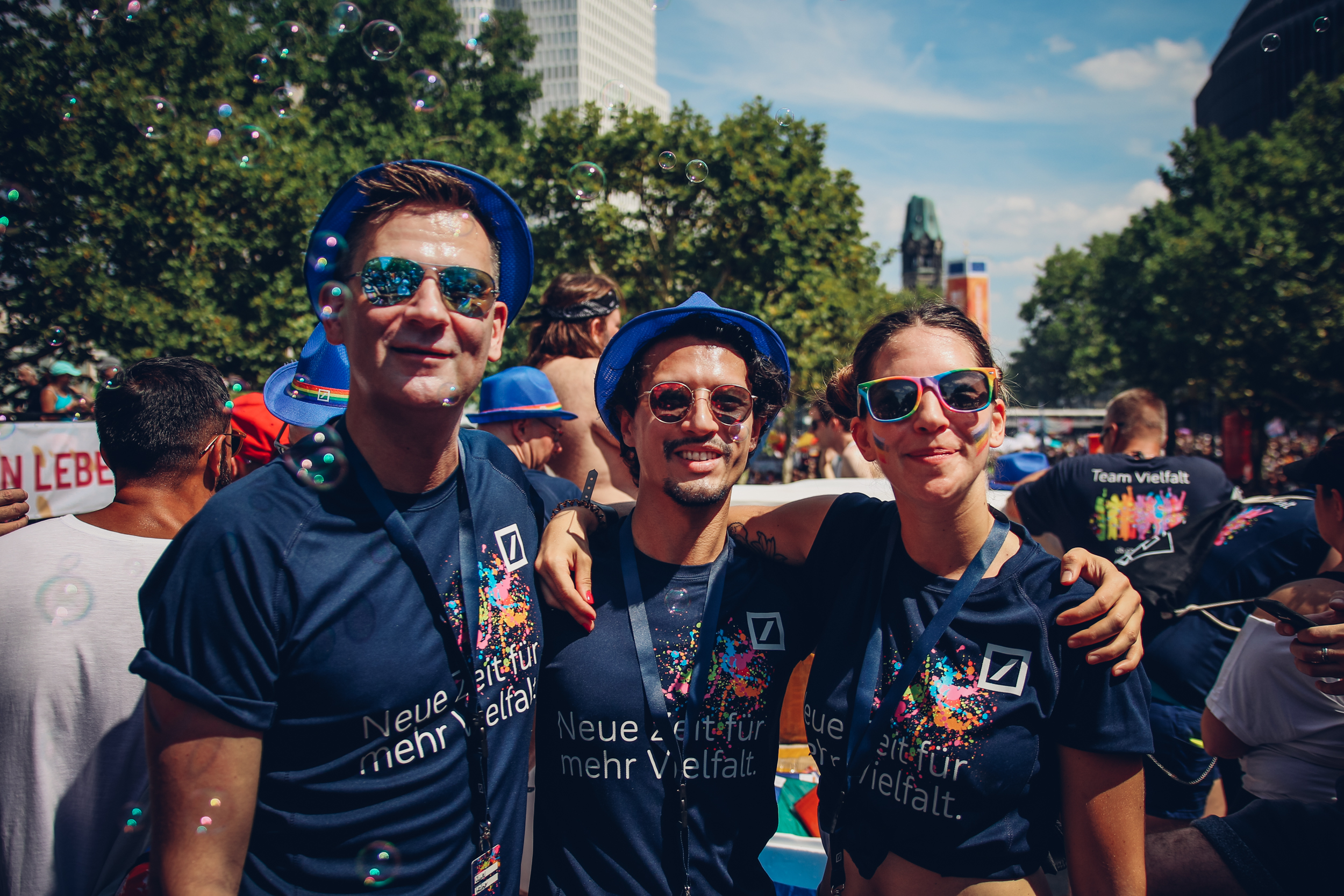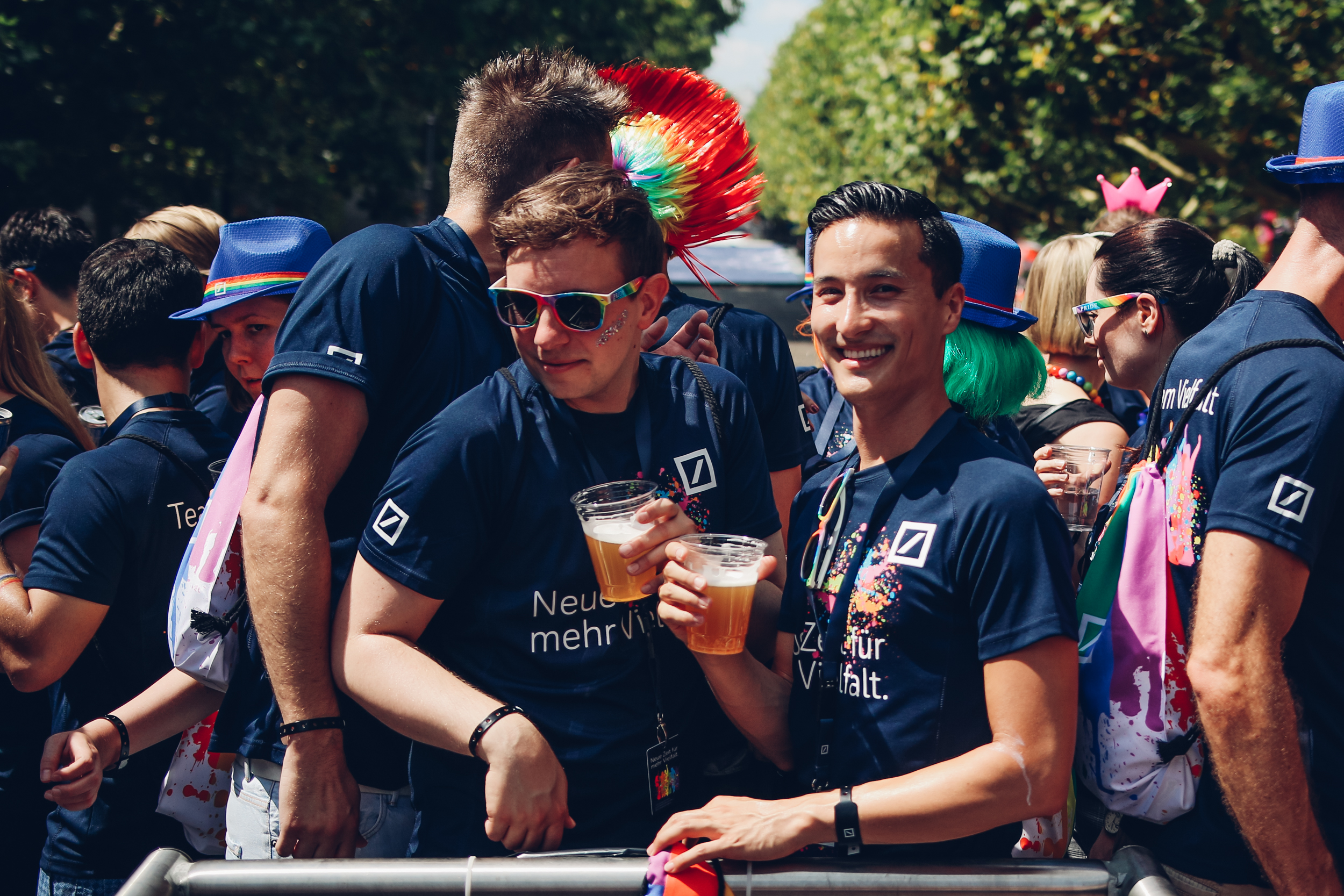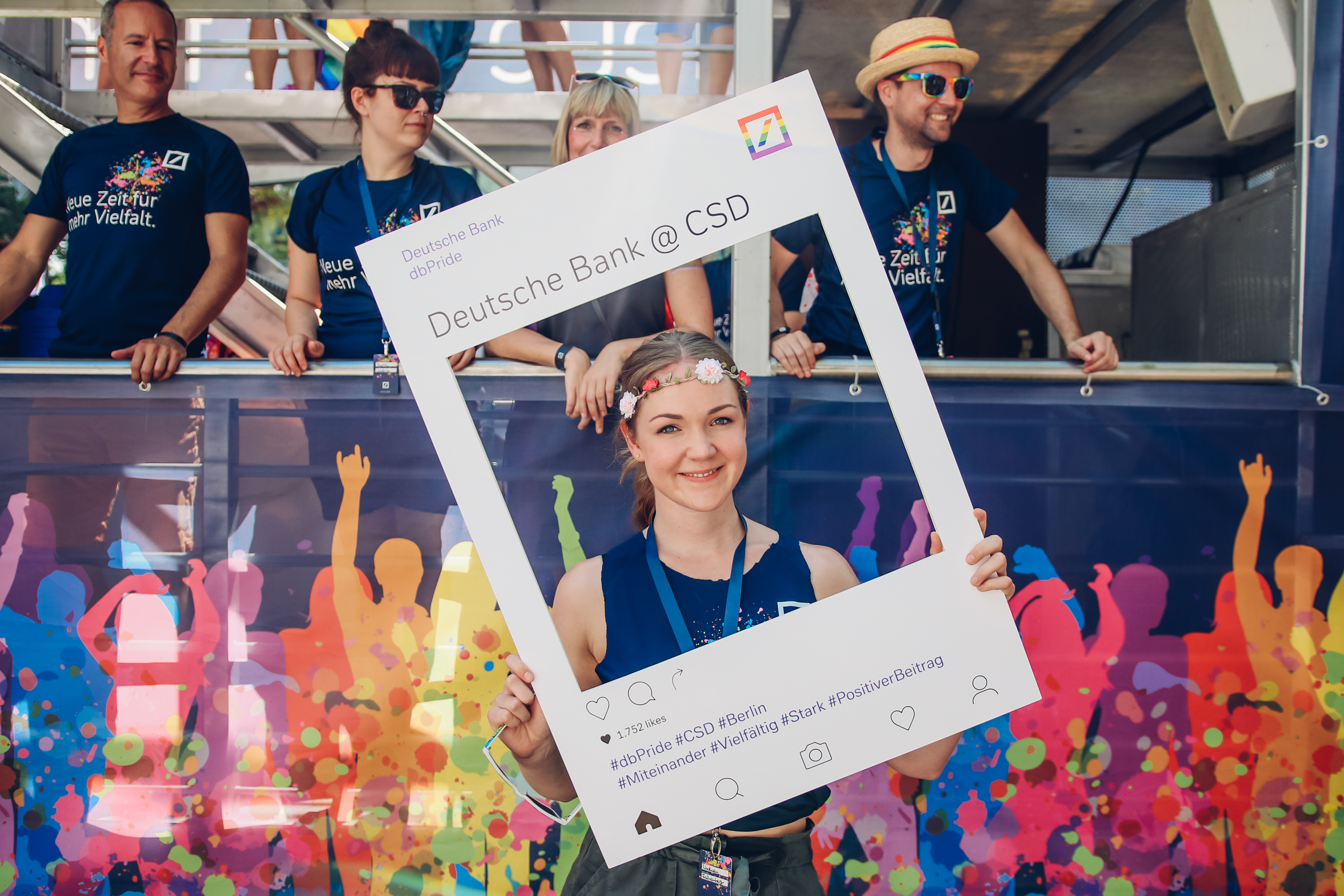 Aber das Engagement der Mitarbeiter der Deutschen Bank wirkt auch im Unternehmen selbst. Seit über 15 Jahren nimmt die Deutsche Bank beim Christopher-Street-Day teil und setzt damit ein Zeichen für Offenheit und Freiheit gegenüber ihren Mitarbeitern und Kunden. Nicht nur in Berlin, sondern weltweit. Die Deutsche Bank war dieses Jahr bei auch bei den Pride-Paraden in New York und London mit einem eigenen Wagen am Start.