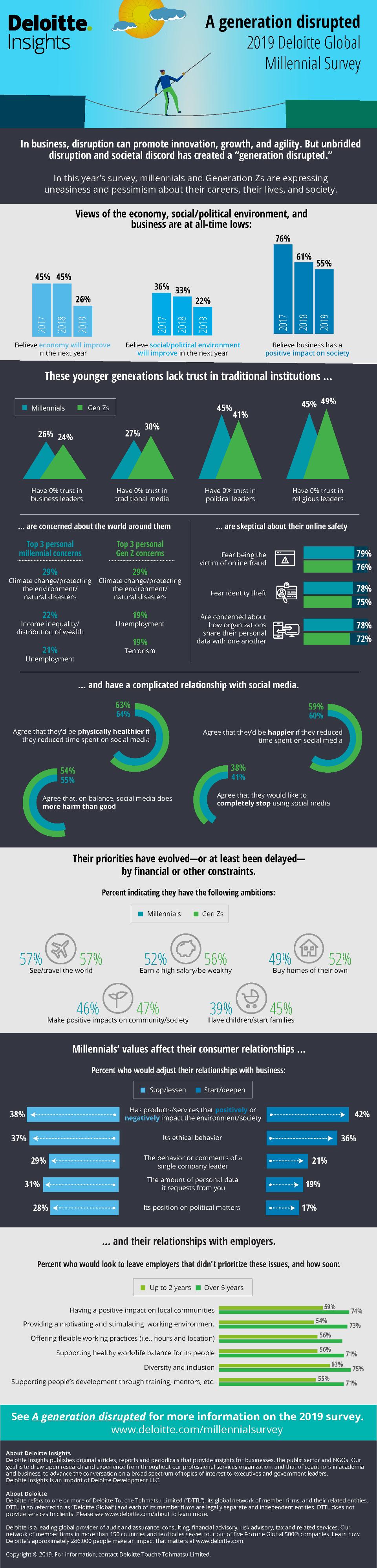 Die Studie offenbart eine Momentaufnahme des Weltbildes der jungen Befragten. Ihre Einstellung gegenüber der globalen politischen Situation, der Wirtschaftslage, der Digitalisierung und ihrer Karrierechancen war noch in keiner der bisher sechs Deloitte Umfragen auf einem derartigen Tiefstand. Generell scheint es den jungen Befragten an Optimismus zu fehlen. In der Umfrage von 2017 und 2018 waren noch 45% der Befragten davon überzeugt, dass die Wirtschaft im darauffolgenden Jahr einen Aufschwung erwarten kann – in der diesjährigen Umfrage nur 26%. Auch die Hoffnung, dass das politische Weltgeschehen sich im nächsten Jahr verbessern wird, sank von 36% auf 22%. Auch traditionellen Institutionen gegenüber werden sie misstrauisch. So haben 45% der Millennials kein Vertrauen in politische und religiöse Führungspersonen. Ihr Sicherheitsgefühl nimmt ebenfalls mit zunehmender Digitalisierung ab. So geben 78% der Befragten an, sich Sorgen über die Verarbeitung ihrer persönlichen Daten im Internet zu machen und sogar die Fälschung der eigenen Identität zu fürchten. Und was ist mit sozialen Medien? Obwohl soziale Plattformen jährlich an Nutzern wachsen, sind 60% der Millennials davon überzeugt, dass sie glücklicher ohne Instagram & Co wären.