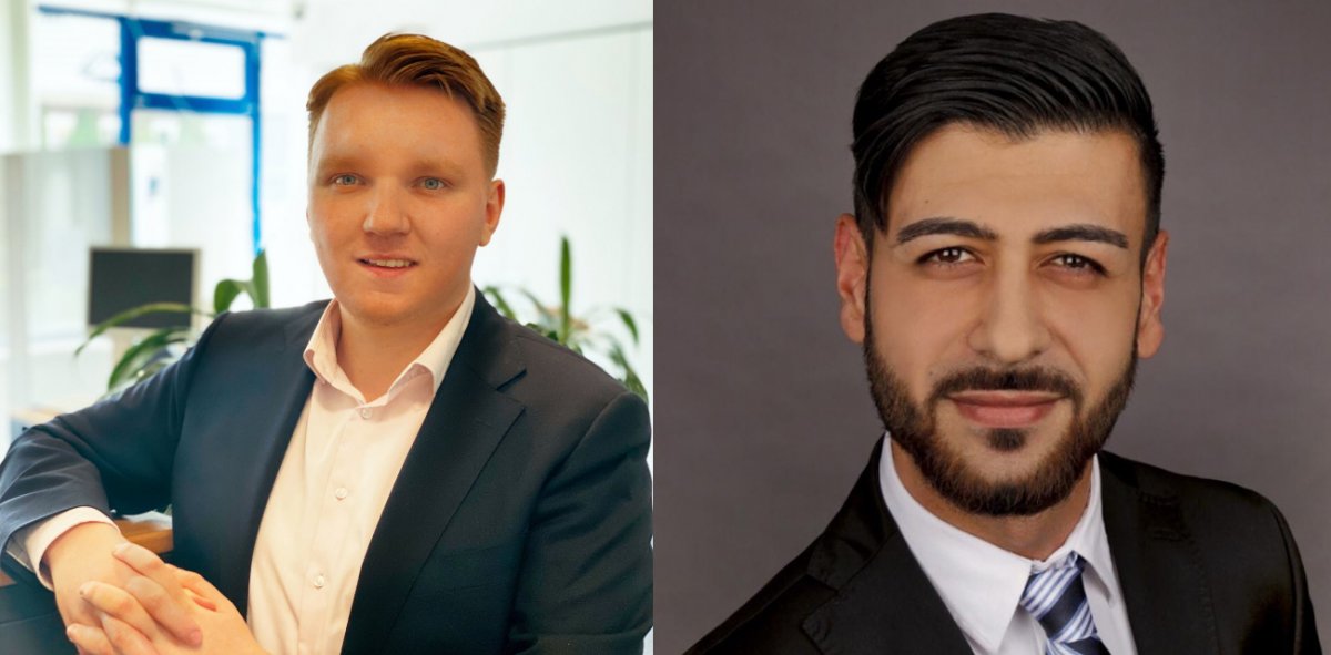 Çağdaş Cebe (rechts) berät Privatkunden in puncto Geldanlage und sieht es als wichtige Aufgabe der Finanzwirtschaft an, insbesondere auch nachhaltige Unternehmen zu fördern. Mathis Froese (links) ist Spezialberater für Investments. Foto: Deutsche Bank.