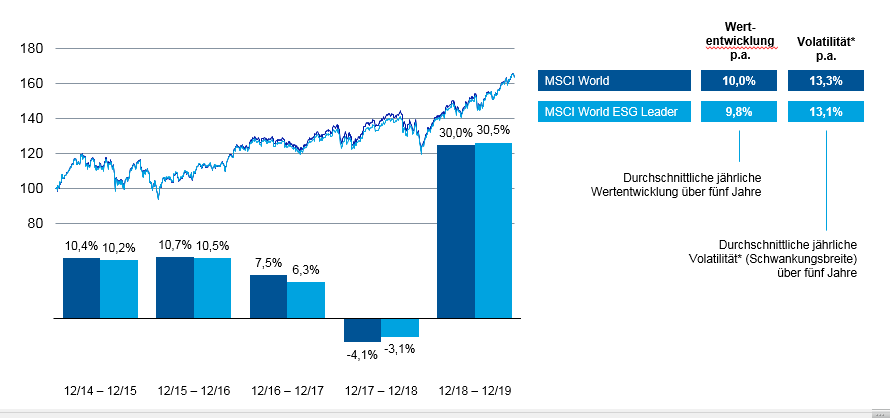 Diese Grafik verdeutlicht, dass nachhaltige Investments sich ähnlich gut entwickeln wie herkömmliche Investitionen. Entwicklungen der Vergangenheit sind natürlich keine Garantie für zukünftige Entwicklungen.