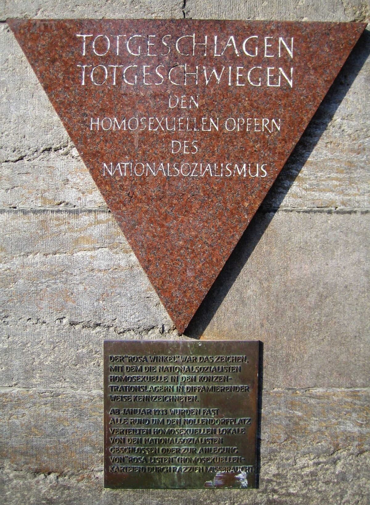 In den 1980er Jahren verwendete die Schwulenbewegung den rosa Winkel, mit dem Schwule in Konzentrationslagern während des Nationalsozialismus gekennzeichnet wurden, um auf Diskriminierung in der Gegenwart aufmerksam zu machen. Diese Gedenktafel erinnert an die Verfolgung Homosexueller während des Nationalsozialismus.