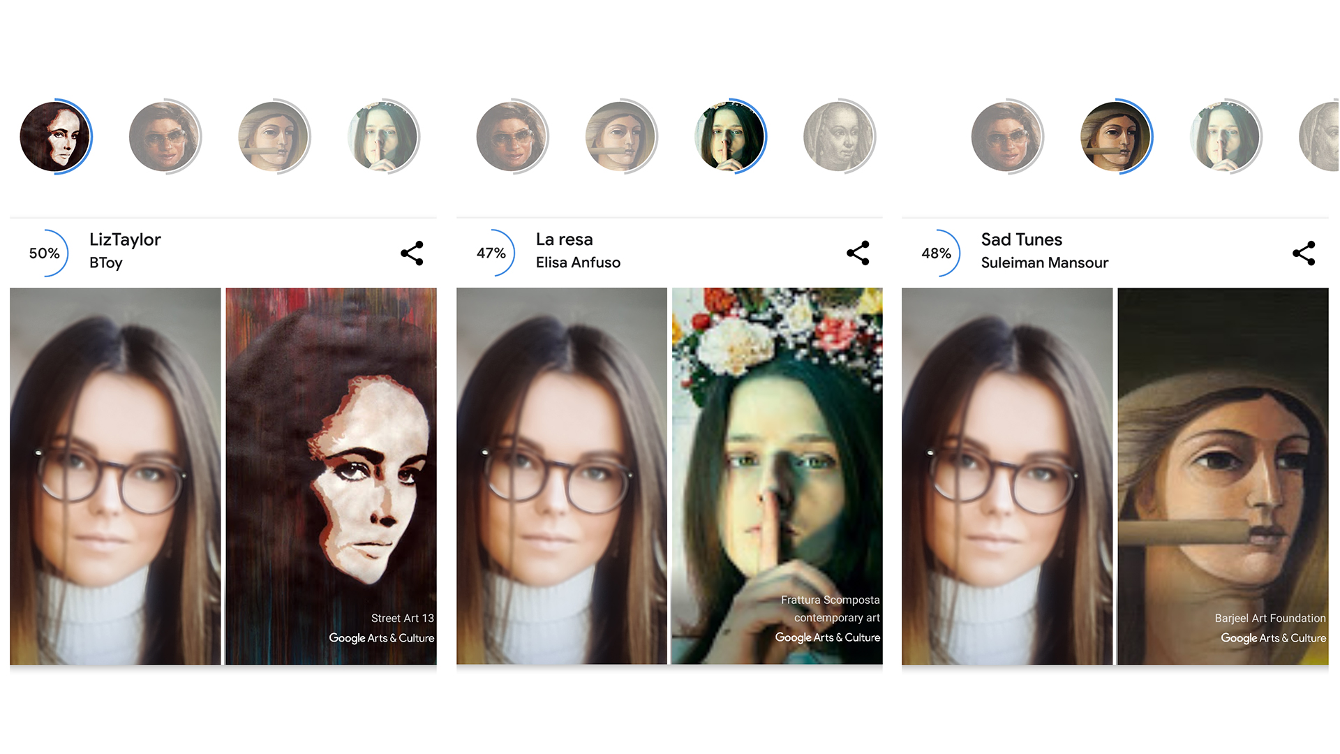 Das eigentliche Problem mit der App, die so ein vielfältiges kulturelles Angebot bietet, ist, dass sie größtenteils auf die Selfie-Funktion reduziert wird, die eigentlich nur als kleine Marketing-Spielerei am Rande gedacht war. Statt sich in den virtuellen Räumen von Museen zu verlieren, die am anderen Ende der Welt liegen und die man vielleicht niemals im realen Leben aufsuchen wird, dominieren die malerischen Doppelgänger das Internet.