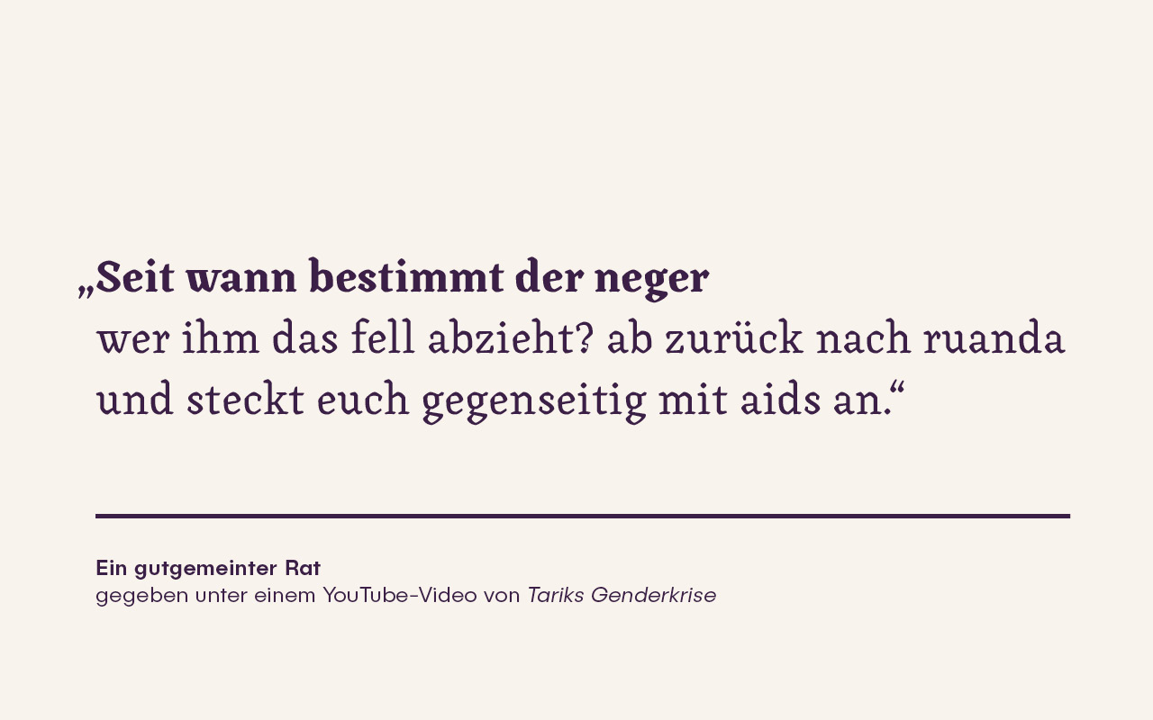 In der Dokumentation “Lösch Dich” wird diese neue Form der Gewalt auf interessante und investigative Weise portraitiert. Journalisten schleusen sich undercover in die Kreise von rechten Digital-Aktivisten ein, die gezielt Hass streuen, sich zusammenschließen und die Medien instrumentalisieren. Aber auch Betroffene von Hate Speech kommen zu Wort und erzählen von den psychischen Folgen und die Konsequenzen für ihr eigenes Verhalten im Netz. Der Netzaktivist und YouTuber Tarik Tesfu, der sich für Feminismus, Gleichstellung und Anti-Rassismus einsetzt, ist einer von ihnen: „Wenn man mit 500 Kommentaren am Morgen wach wird und sich eigentlich denkt, „Heute ist ein geiler Tag“, dann aber liest, dass man für andere ein Vollpfosten ist, dann ist das verletzend. Wenn Du 2-3 Kommentare liest, denkst du Dir, come on, was soll’s? Aber diese Masse auszuhalten, das ist schon heftig.” Und diese Kommentare sehen so aus: „In der Zeit in der Du hier belanglose Scheiße redest, hättest Du auch einen Schal stricken können, damit arme Kinder in Afrika nicht erfrieren müssen. Lösch Dich einfach.” Oder so: „Ich bin nur auf dieser Seite, um alle Freunde der vulgären Analyse zu grüßen. Hurra, ich bin einer von 800 der Daumen Runter gedrückt hat. ”