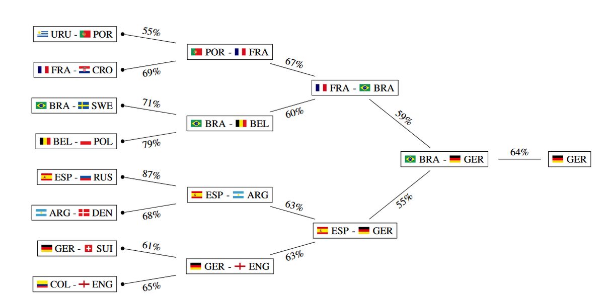 Das Endergebnis ist der Durchschnitt von allen zufällig simulierten Turnierbäumen. Die Stärken der Mannschaften werden aus unterschiedlichen Faktoren ermittelt: Ihr Platz in der FIFA-Rangliste, ihre Zahl an Champions League-Spielern und sogar das Bruttoinlandsprodukt des Landes. Aufgrund dieser Analyse kommen Groll und sein Team zum Schluss, dass höchstwahrscheinlich Deutschland in Russland Weltmeister wird.