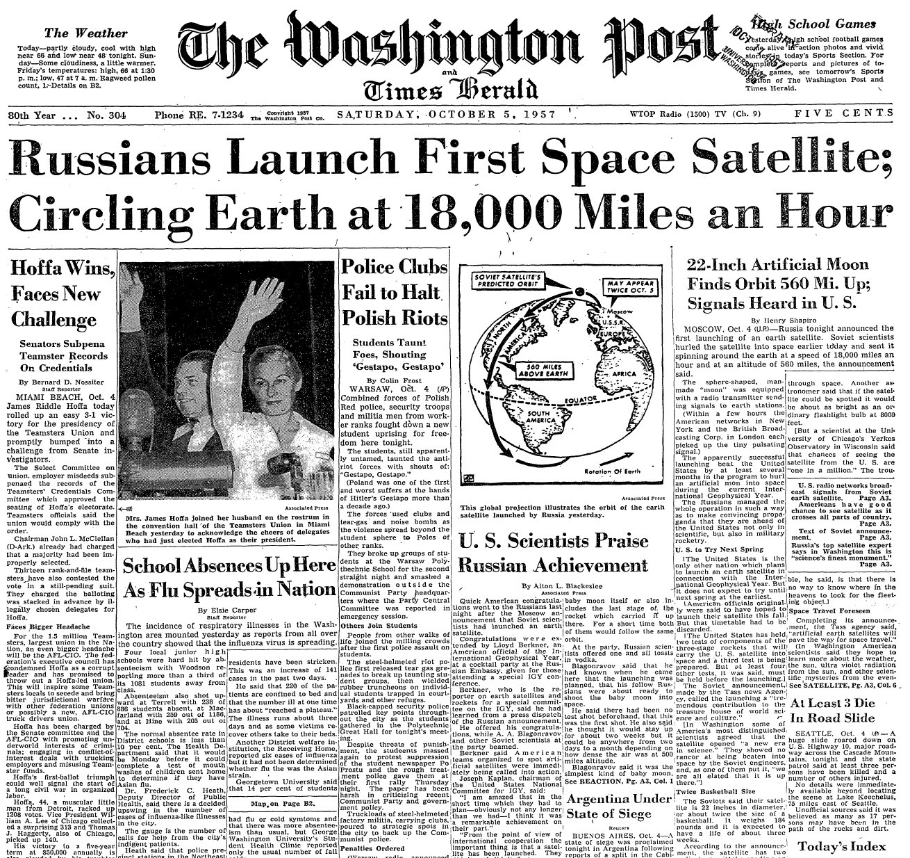 Der Artikel über den Start des Sputnik-Satelliten in der Washington Post aus dem Jahr 1957.