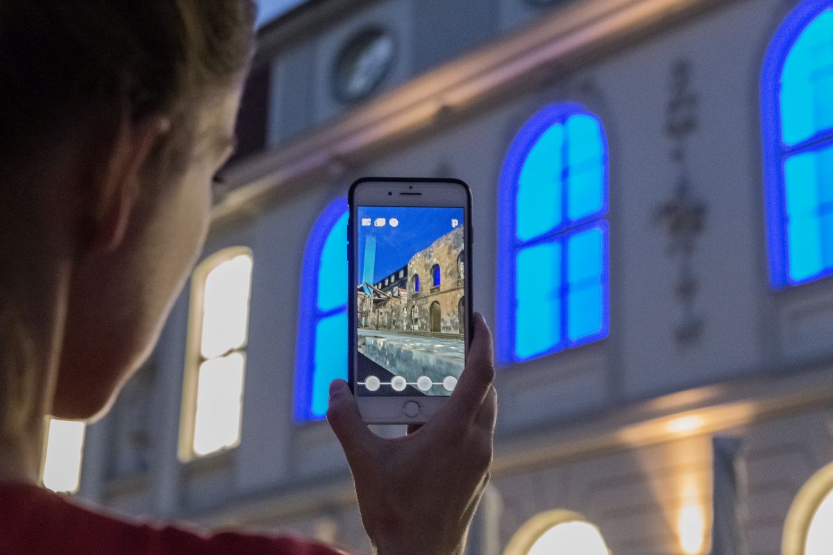 Eine zweite App beschäftigt sich mit der Geschichte des Gebäudes und nutzt dafür Techniken der ‘Augmented Reality’. Das Haus hat eine lange Geschichte – wir wollten dieses historische Spannungsverhältnis zwischen seinem Originalzustand, der vollständigen Zerstörung im Krieg und der Rekonstruktion in den 1960er nachvollziehbar machen. Durch die App kann man in ein anderes Jahrhundert schauen und die Geschichte ganz nah erleben.