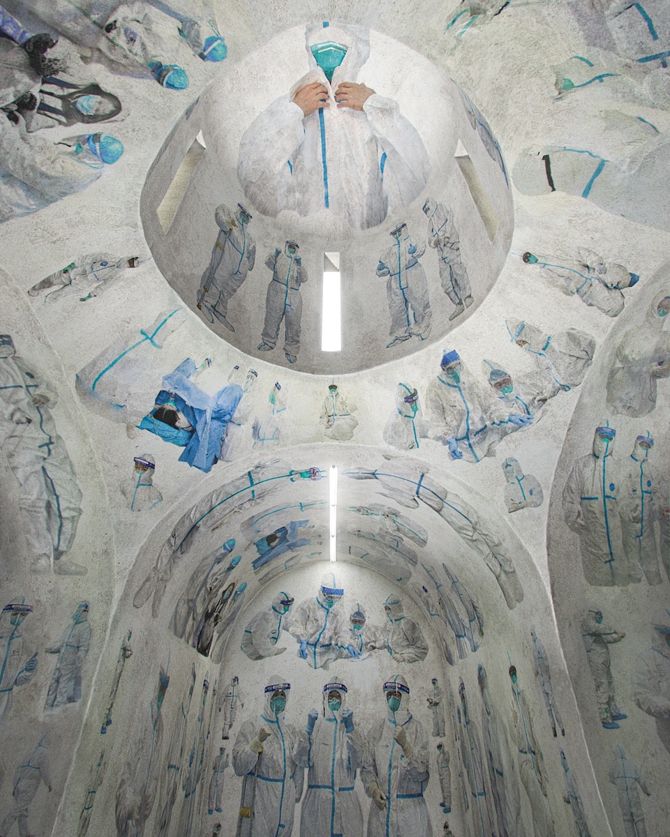 Zur Ehrung all derjenigen Menschen, die sich aktuell und tagtäglich den Gefahren einer Ansteckung mit dem Coronavirus aussetzen, hat der aus Shanghai stammende Künstler die Wände und Decken einer historischen Kapelle neu gestaltet. Er verzierte die Wände mit Fresken und Bildern, die sich ikonografisch stark an den Stil von christlichen Bild-Szenen anlehnen. Allerdings stellen sie die echten Retter in der Krise dar: Ärzt*innen, Krankenpfleger*innen und Helfer*innen, allesamt in weiße Schutzanzüge gekleidet, mit Mundschutz und Schutzbrille.