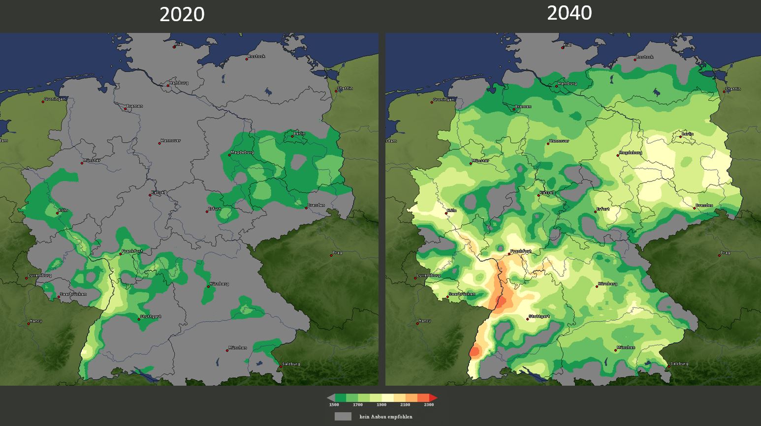 Die Legende zeigt, in welchen Gebieten der Anbau von Wein empfohlen wird. Collage erstellt aus Grafiken des Portals Klimafolgenonline.com (Potsdam-Institut für Klimafolgenforschung und WetterOnline Meteorologische Dienstleistungen)