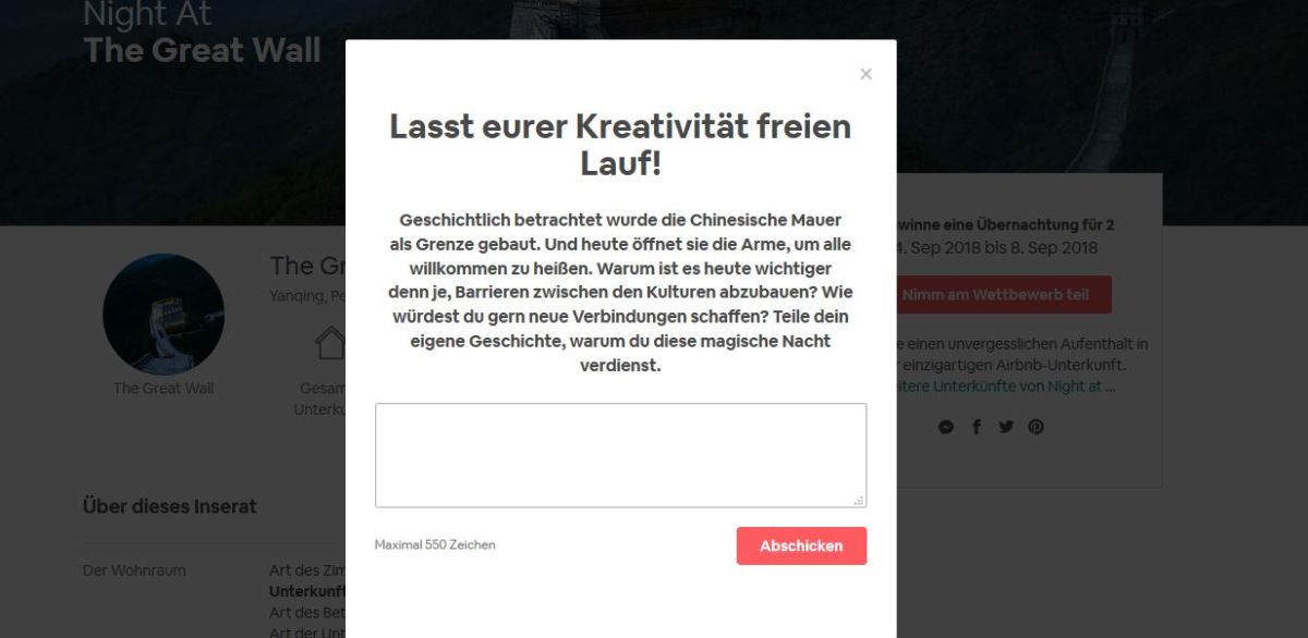 Damit die Gäste nicht nur für ein paar schöne Bilder, sondern auch wegen der Idee kommen, kann man die exklusive Übernachtungsmöglichkeit (zunächst?) nur gewinnen. Alle Teilnehmer müssen dem Unternehmen in 550 Zeichen erklären, warum es wichtig ist, Grenzen zwischen Kulturen abzubauen und neue Verbindungen zu schaffen. Im Sinne einer Mauer, die nicht ausgrenzt, sondern Willkommen heißt.