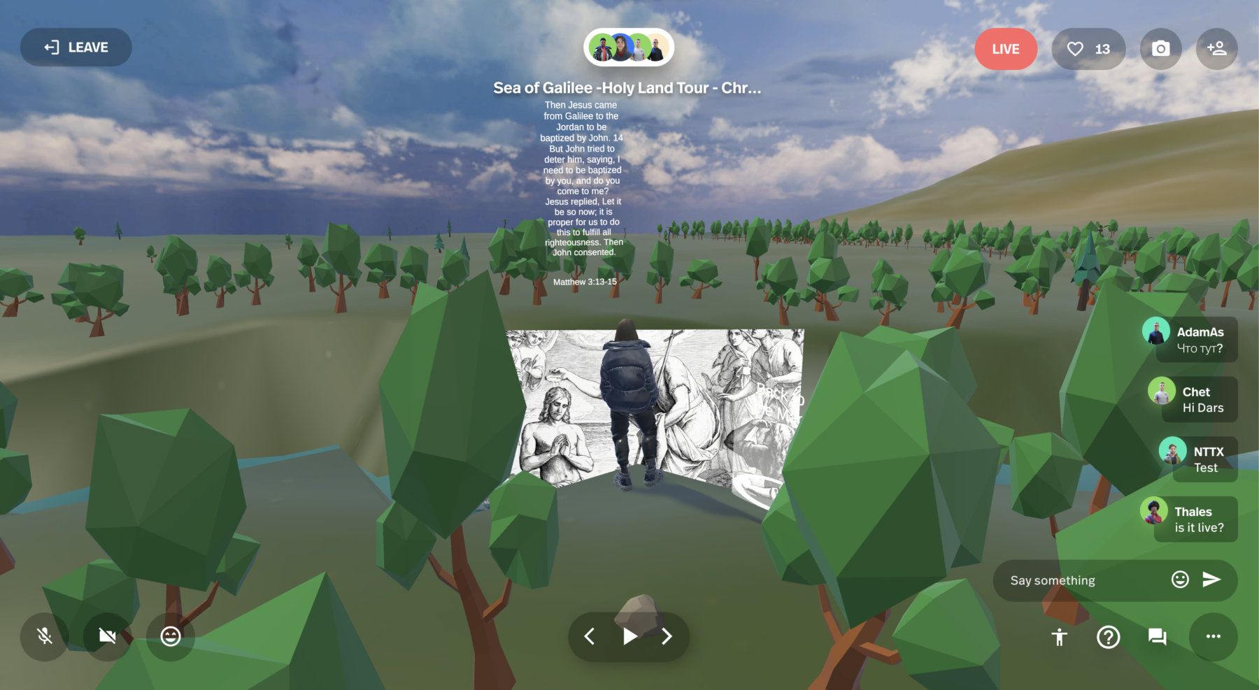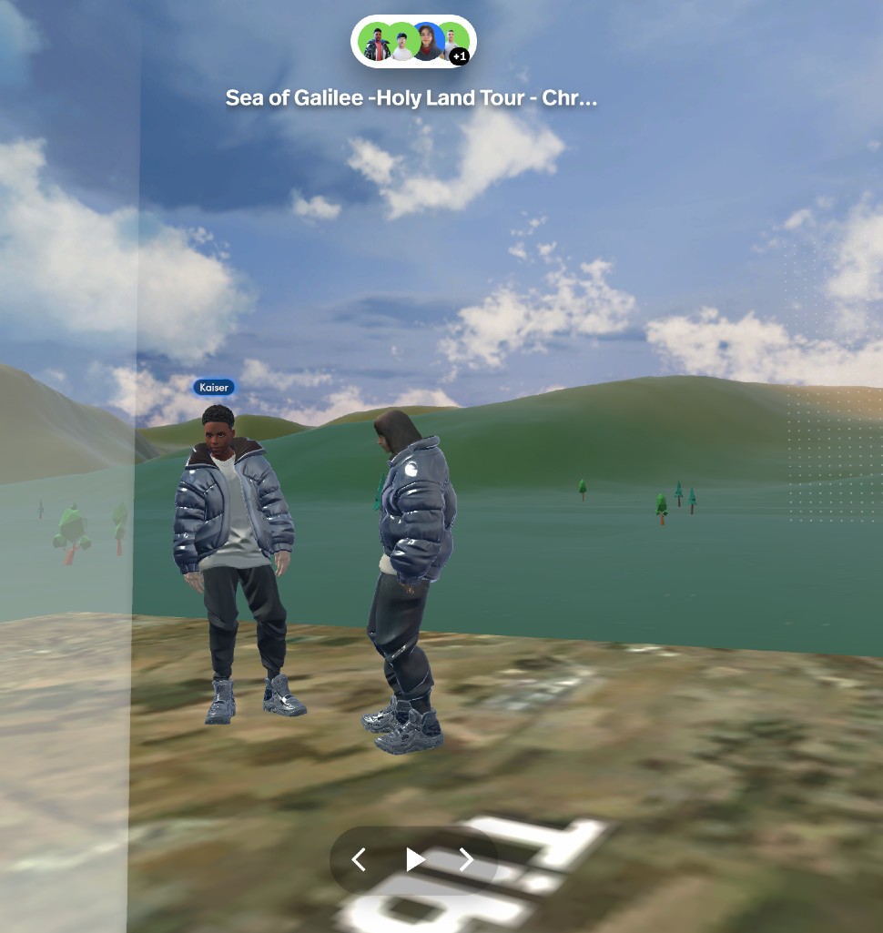 Als ich keine Lust mehr auf Verschwörungstheorien habe, wechsel ich den Raum und lande bei einem Hip-Hop Film-Festival, wo ein DJ auflegt und Avatare sich auf Russisch unterhalten. Ich verstehe nichts, also beame ich mich zum See Genezareth in einen Space namens „Holy Land Tour – Sea of Galilee – Christian Living“. Irgendwie nicht überraschend, dass das Christentum im Metaverse bereits vertreten ist. Auch hier wird also bereits missioniert.