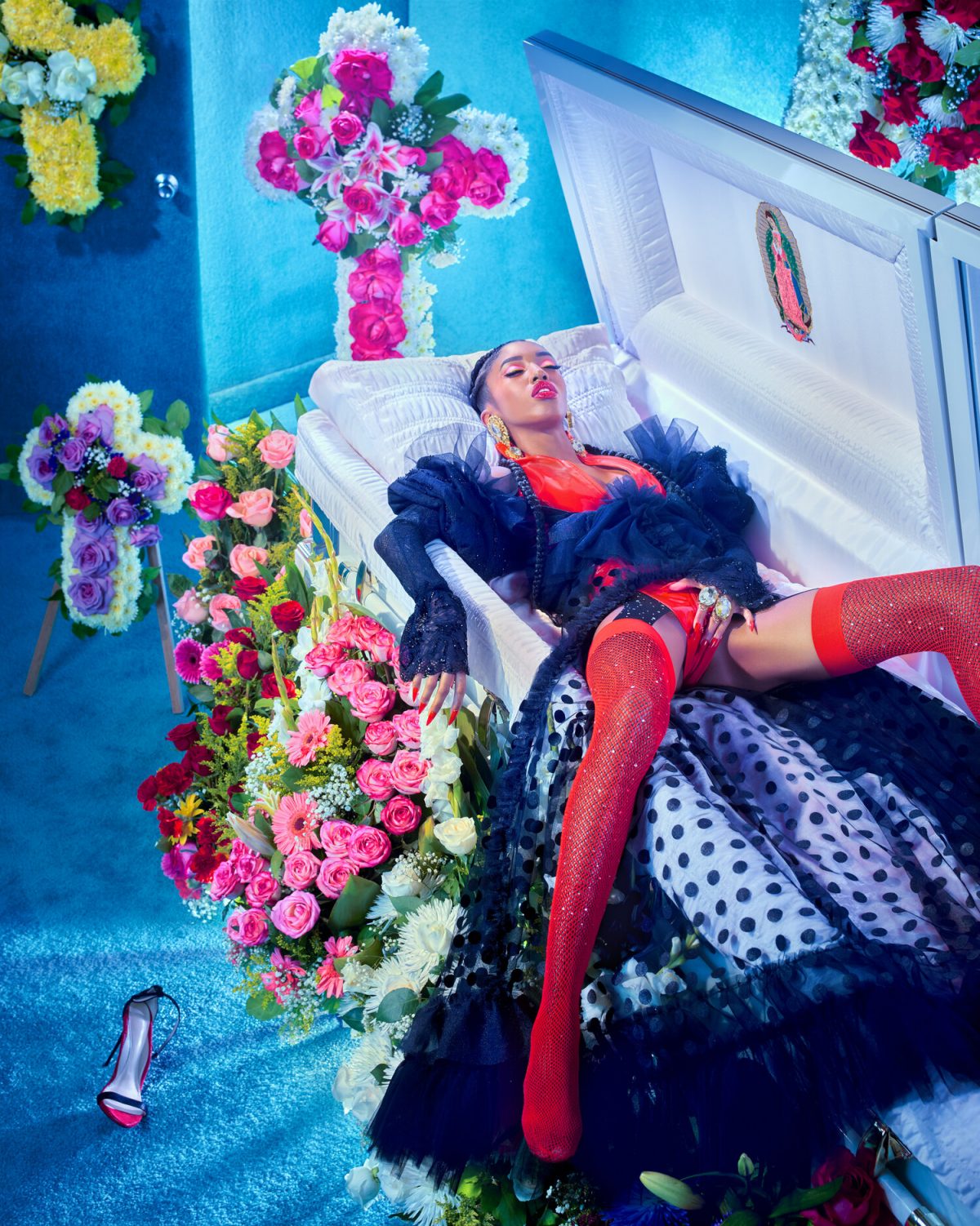 Pols Bilder provozieren spielerisch und drehen dabei altbekannte Rollenbilder um. Die Fetischisierung des Sarges in ein Bett der weiblichen Lust, behütet von der vulvaförmigen Jungfrau Maria, macht bewusst auf patriarchalische Klischees aufmerksam, die die weibliche Lust tabuisieren. Bild: Pol Kurucz
