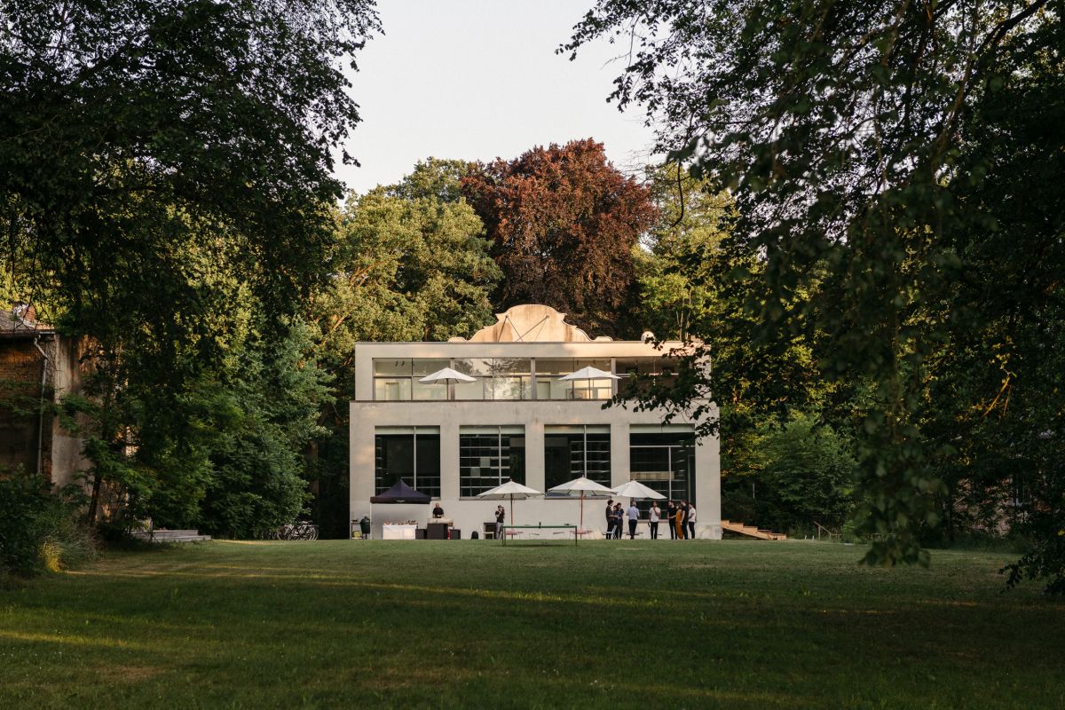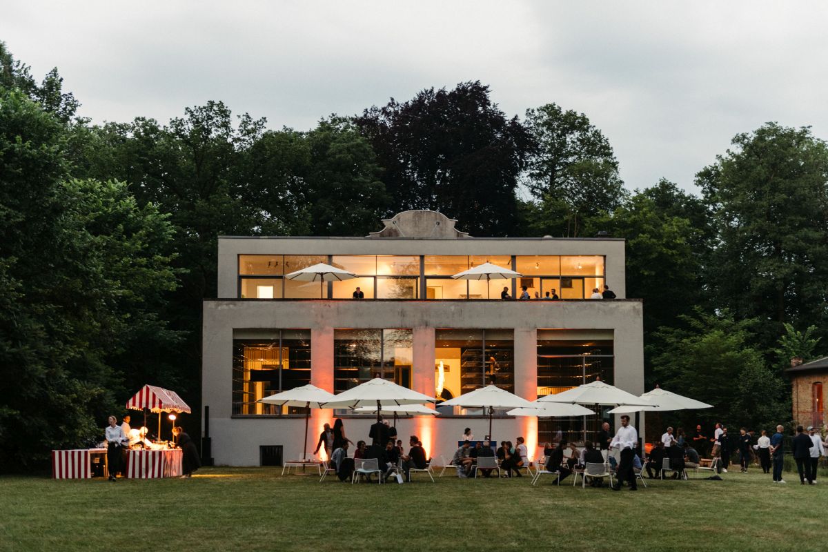 Der Empfang wird vor dem 1907 zur Villa umgebauten Verwaltungsgebäude der ehemaligen Wehrmühle abgehalten. Seine antike Fassade erinnert an alte Zeiten, von der Rückseite aber bemerkt man kaum mehr, dass die Ursprünge der Anlage bis ins tiefe Mittelalter zurückreichen. Selbst die alte Scheune, direkt neben den Überbleibseln der Mühle, wurde zu einem Eventspace umgebaut.
