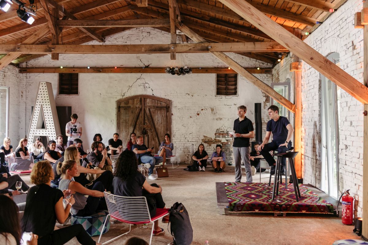 Während im alten Verwaltungsgebäude die Workshops stattfinden, werden in der ausgebauten Scheune Panels und Talks abgehalten. Dort haben wir den Philosophen und Mitgründer der School of Life Robert Rowland Smith getroffen, der in Oxford seinen Doktor machte und inzwischen Unternehmen berät. Mit ihm sprechen wir, wie dieser drastische Jobwechsel zustande kam, ob es Sinn macht, über die Zukunft der Arbeit zu sprechen und was ein Design des Vertrauten mit Büroräumen zu tun hat.