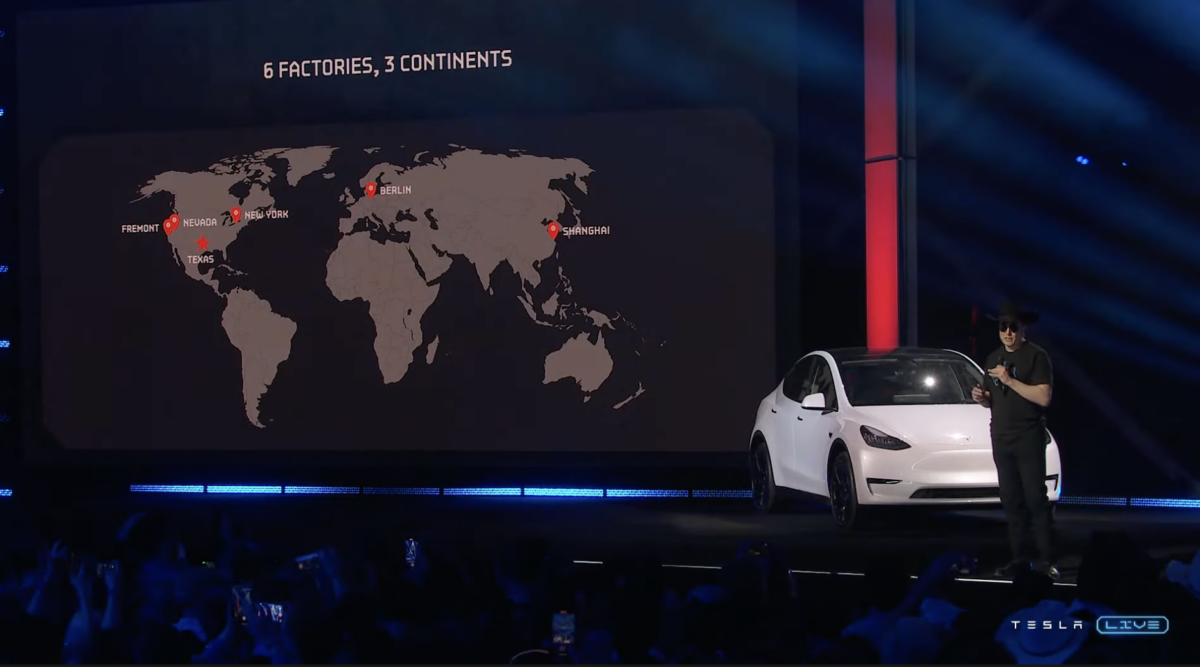 Dann führt Musk das Publikum durch Vergangenheit, Gegenwart und Zukunft. Er geht die Automodelle der Geschichte Teslas durch, die auf der Bühne ausgestellt sind. Stolz zeigt er auf einer Karte, wo sich heute die sechs Tesla Fabriken befinden, von denen eine in Berlin ist.