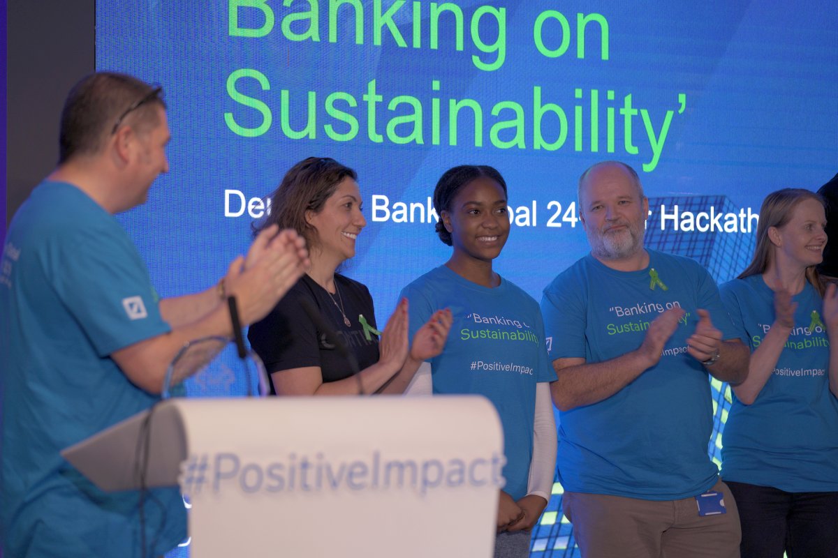 Das Gewinnerteam aus London beschäftigte sich wie 80% der anderen Teams auch mit Anastasias Idee zu einem Nachhaltigkeits-Score. Foto via Deutsche Bank.