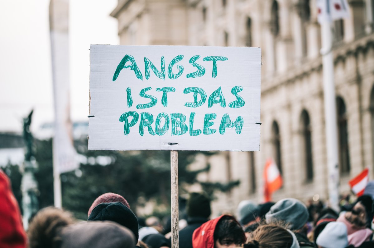 Die Pandemie macht deutlich, wie schnell Zweifel am wissenschaftlichen Konsens gesäht werden können. Bei einer Anti-Corona Demo im Januar 2021 hält ein Teilnehmer ein Schild mit dem Schriftzug „Angst ist das Problem”. Bild: Ivan Radic, Wikimedia Commons.